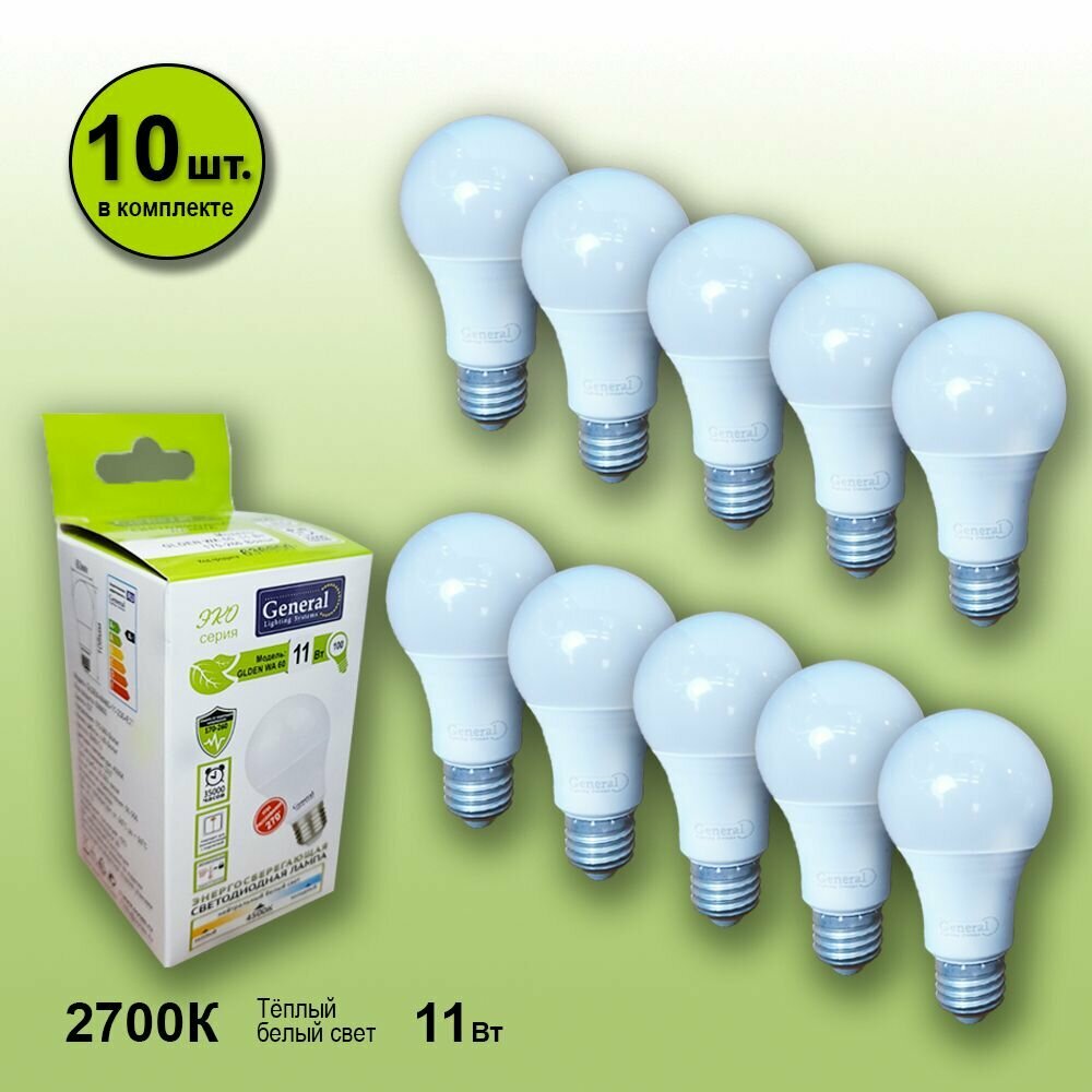 Лампочка светодиодная, General, Комплект из 10 шт., 11 Вт, Цоколь E27, 2700К, Форма лампы Груша, WA60