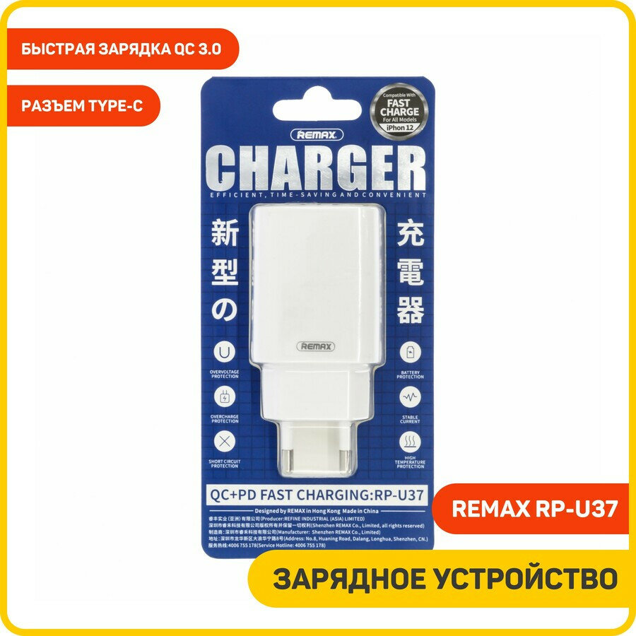 Сетевое зарядное устройство (СЗУ) Remax RP-U37 QC3.0 (USB/Type-C) 3 А, белый
