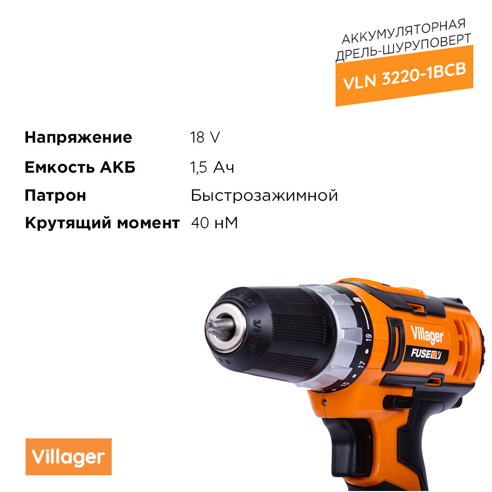 Аккумуляторная дрель-шуруповерт Villager VLN 3220-1BCB / Аккумуляторная дрель Вилладжер 40 Нм. 1,5 Ач (автосервис)