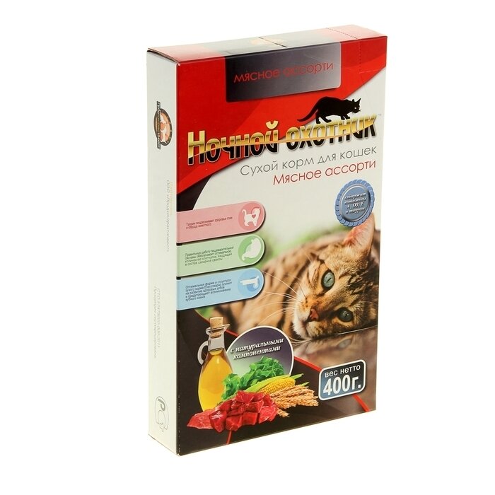 Ночной охотник сухой для кошек мясное ассорти 400г, картонная коробка