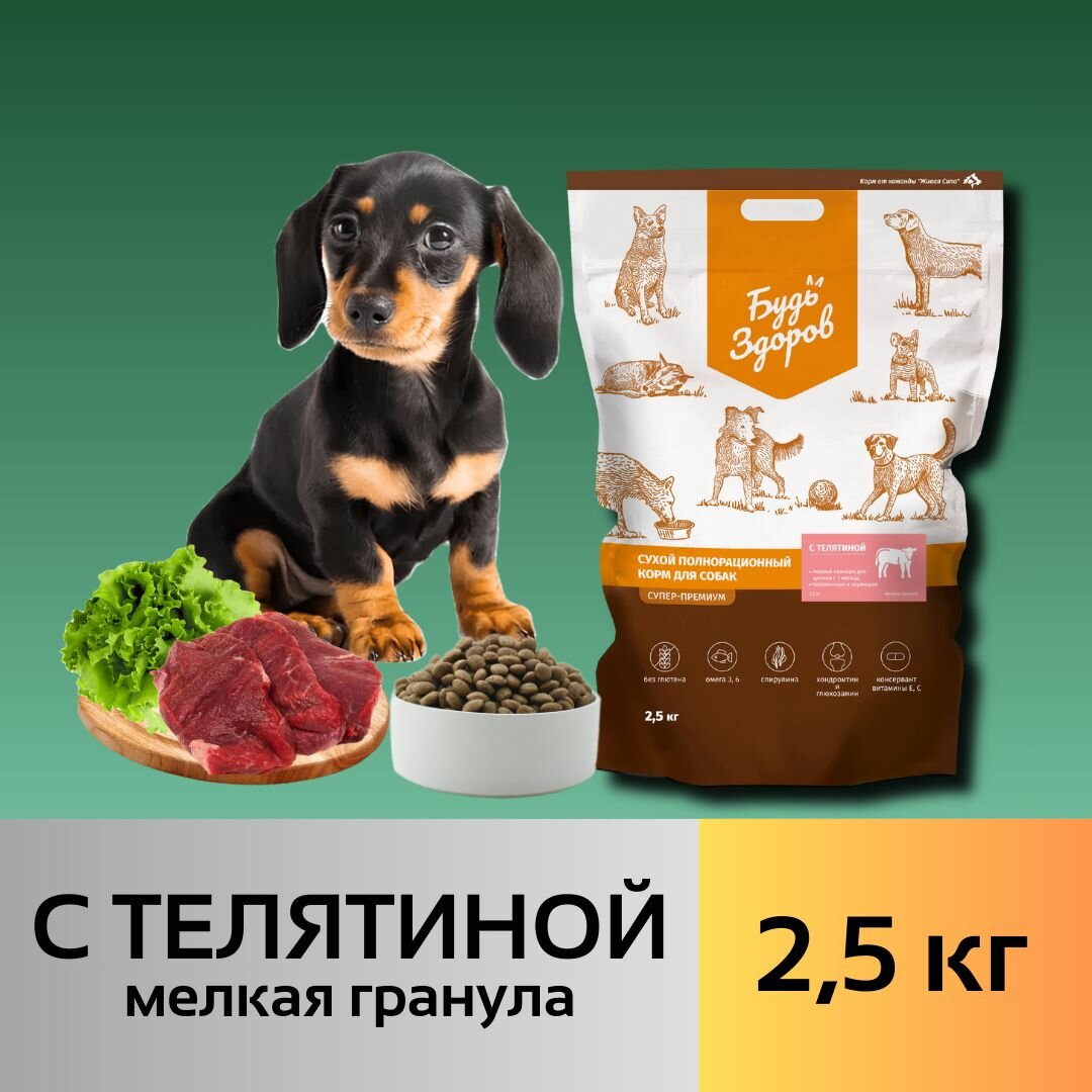 Купить Будь Здоров. Сухой полнорационный корм - прикорм для щенков с 1 месяца, беременных и кормящих сук, с телятиной, мелкая гранула 2,5 кг