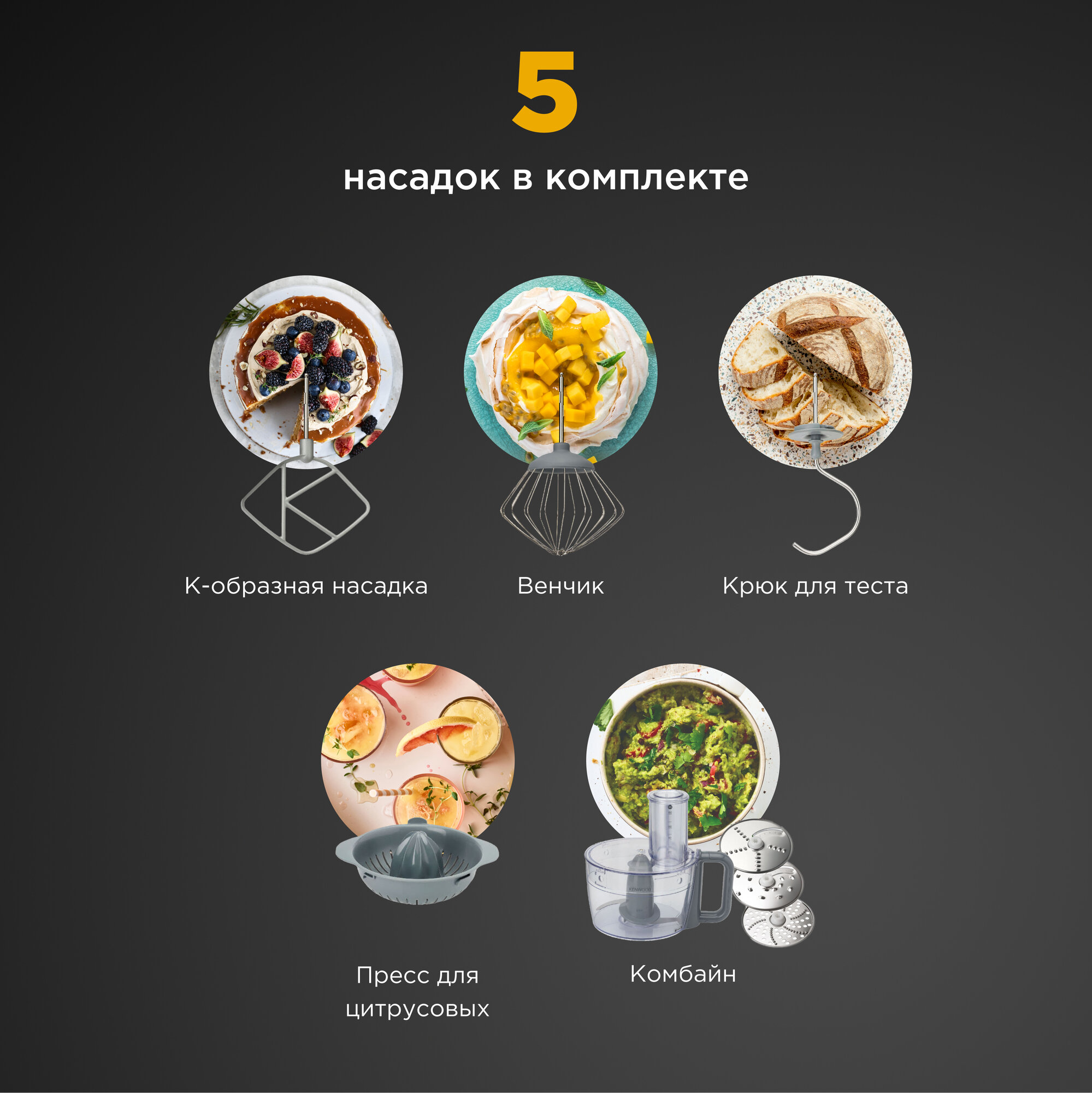 | Подробная комплектация | Кухонная машина; Насадки: к-образная насадка, крюк для теста, венчик, комбайн, цитрус-пресс, рубящее лезвие (3 диска для нарезки); Чаша 4,3л; Инструкция. |