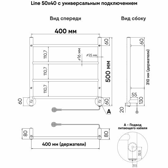 INDIGO Полотенцесушитель Line б/п (electro) 50/40 (скр.монтаж, унив.подкл.R/L, Полиров.) LСLE50-40R