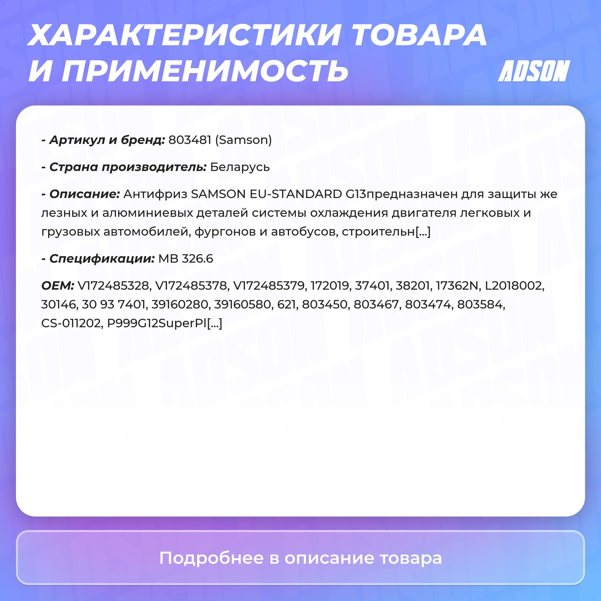 СохранитьАнтифриз, готовый раствор EU-Standard G13G12++ фиолетовый -37°C, 5кг SAMSON интересное: