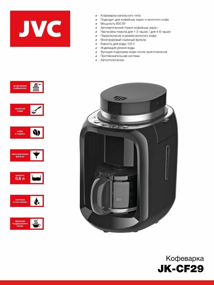 Кофеварка JVC JK-CF29 с кофемолкой, подогрев, капля-стоп, 0,6 л, 600 Вт интересное: