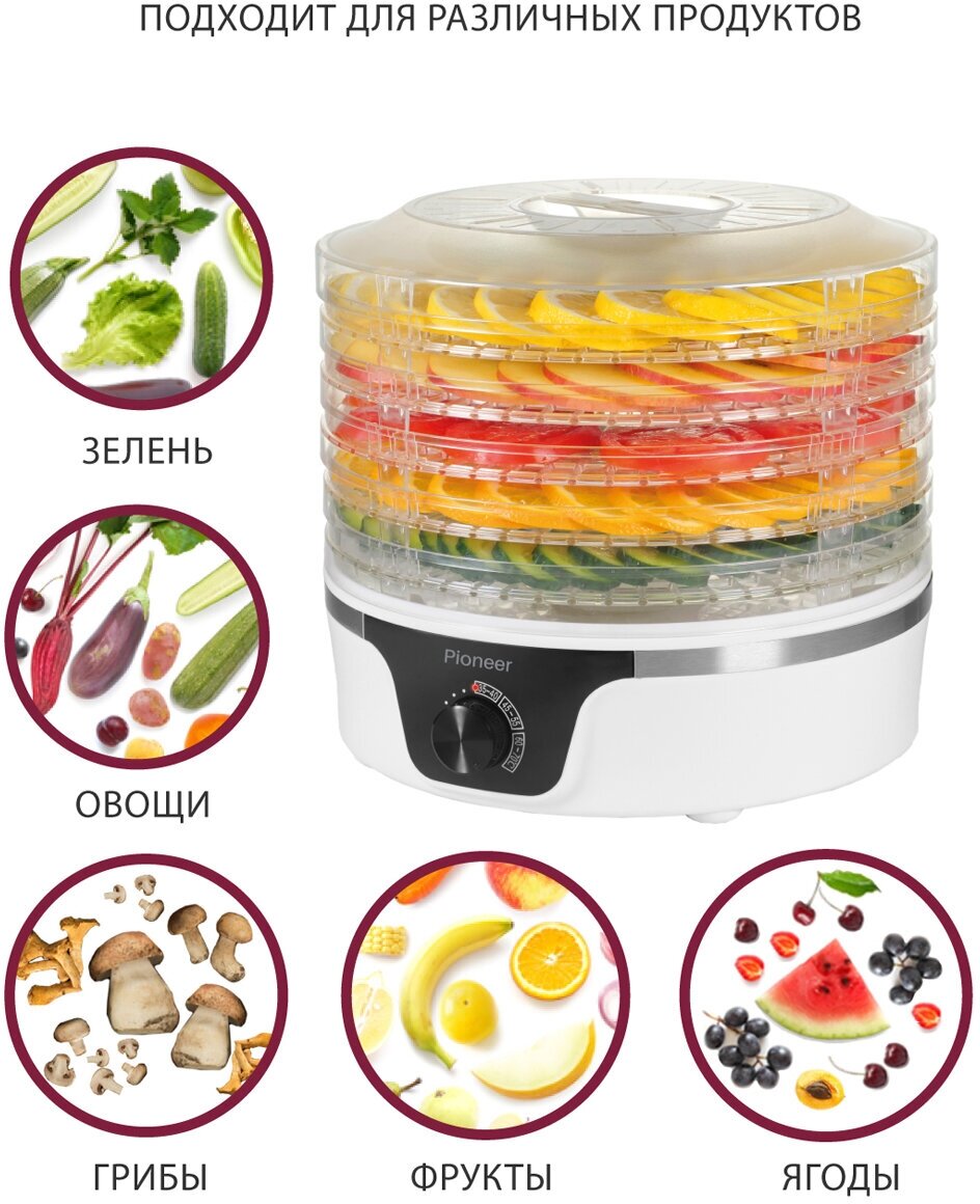 Электросушилка для овощей, фруктов, ягод и грибов Pioneer FD105 c ускоренной подачей воздуха и регулировкой температуры, 5 cъемных поддонов, 380 Вт интересное: