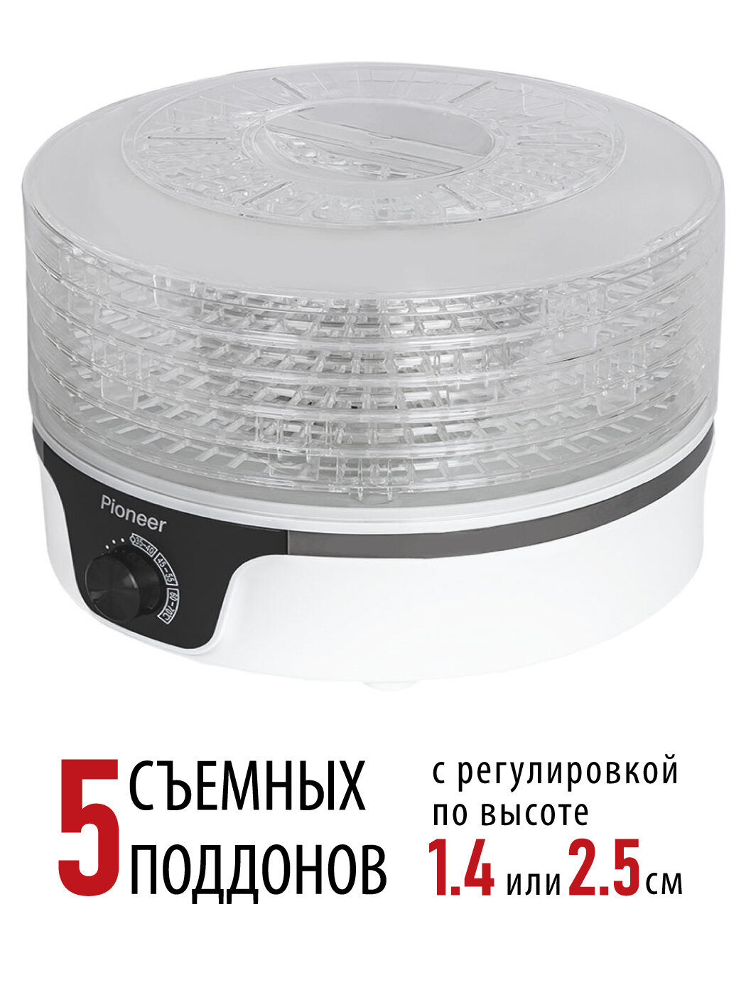 Электросушилка для овощей, фруктов, ягод и грибов Pioneer c ускоренной подачей воздуха и регулировкой температуры, 5 cъемных поддонов, 380 Вт