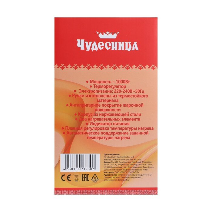 Вафельница-орешница электрическая "Чудесница" ЭВ-2Ч, мощность 1000Вт, 12 полуформ орешниц, тефлоновое покрытие жаропрочной поверхности, автоматическое поддержание заданной температуры нагрева.