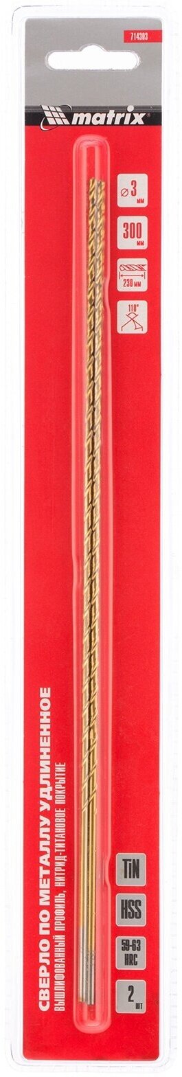 Сверло спиральное по металлу 3 x 300 мм, HSS, 2шт, нитридтитановое покрытие Matrix 714303