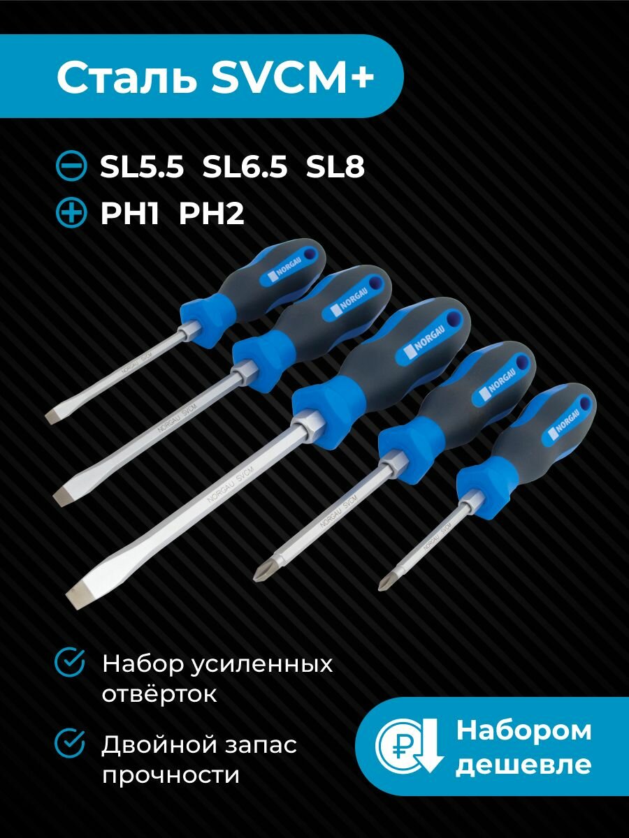 Купить Набор отверток усиленных (SL+PH) NORGAU Industrial из стали SVCM 5 предметов