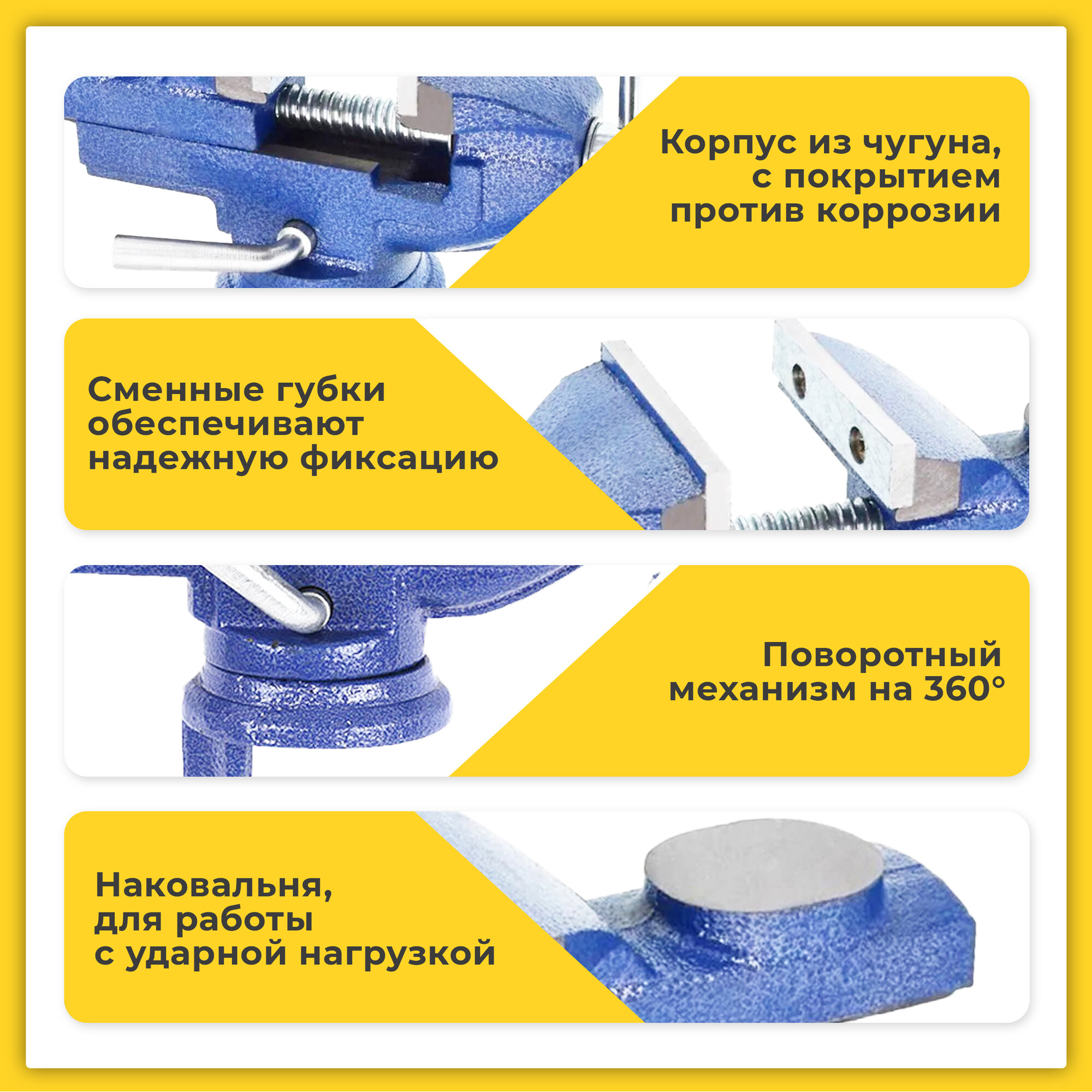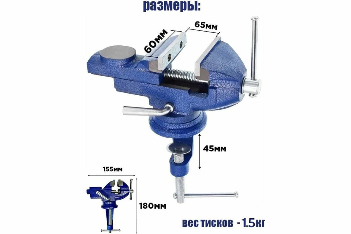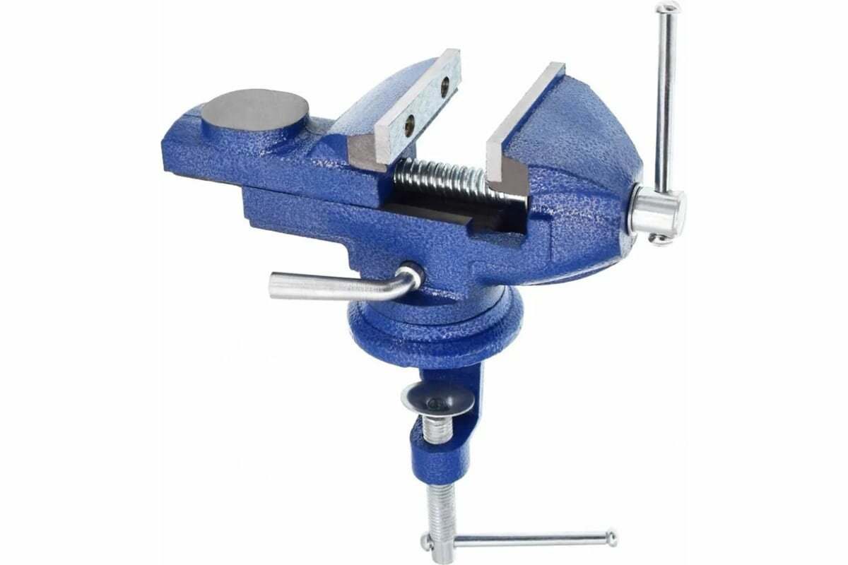 Тиски слесарные 60 мм, настольные с наковальней и поворотным механизмом, ударопрочные, чугунные, синие