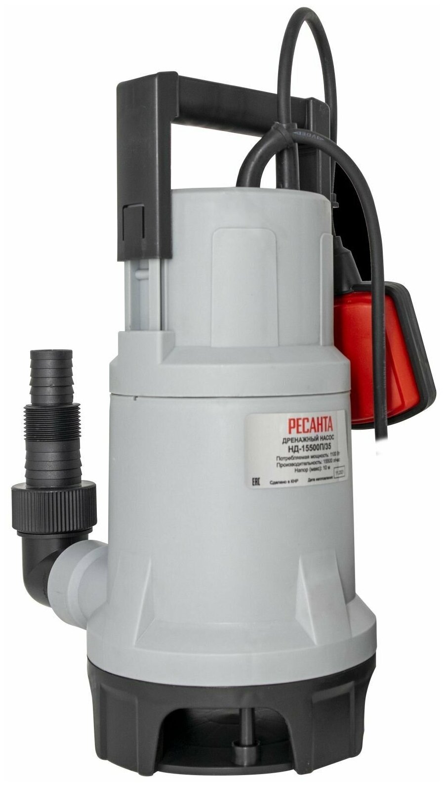 Насос дренажный погружной РЕСАНТА НД-15500П/35 для грязной воды (258 л/мин, с поплавковым выключателем) для откачки воды из водоемов, шахт, подвалов, помещений, бассейнов / для дома и дачи