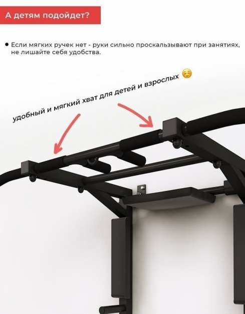 | Минусы: | Подушка под спину крепится на саморезы и буквально с любым усилием на нее разъезжается с турником, затем отваливается |