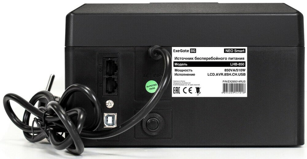 ИБП ExeGate NEO Smart LHB-850. LCD. AVR.8SH. CH. RJ. USB <850VA/510W, LCD, AVR, 8*Schuko, RJ45/11, USB, 4*USB-порта для зарядки, Black> EX295014RUS