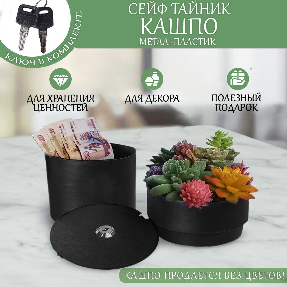 Копилка Сейф тайник Цветочный горшок N 1 / Горшок для цветов, шкатулка декоративная, кашпо, копилка металлическая для денег, монет и купюр, драгоценностей, подарок флористу