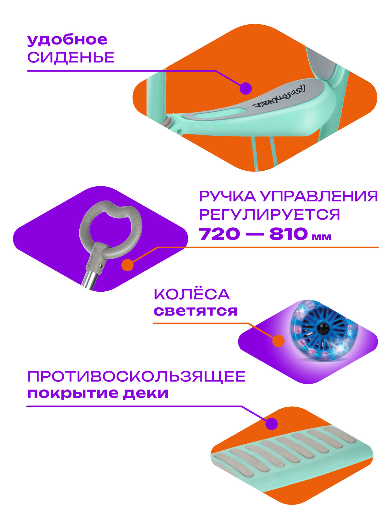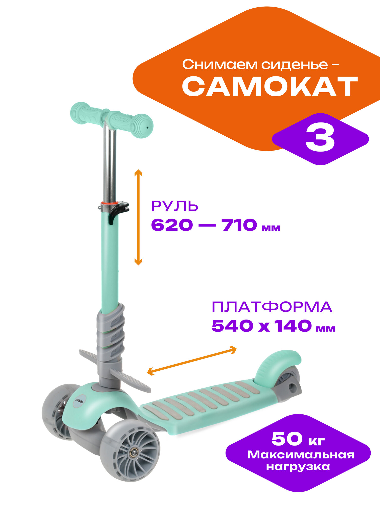 Самокат Moby Kids Pony 3 в 1, свет. кол., мятный