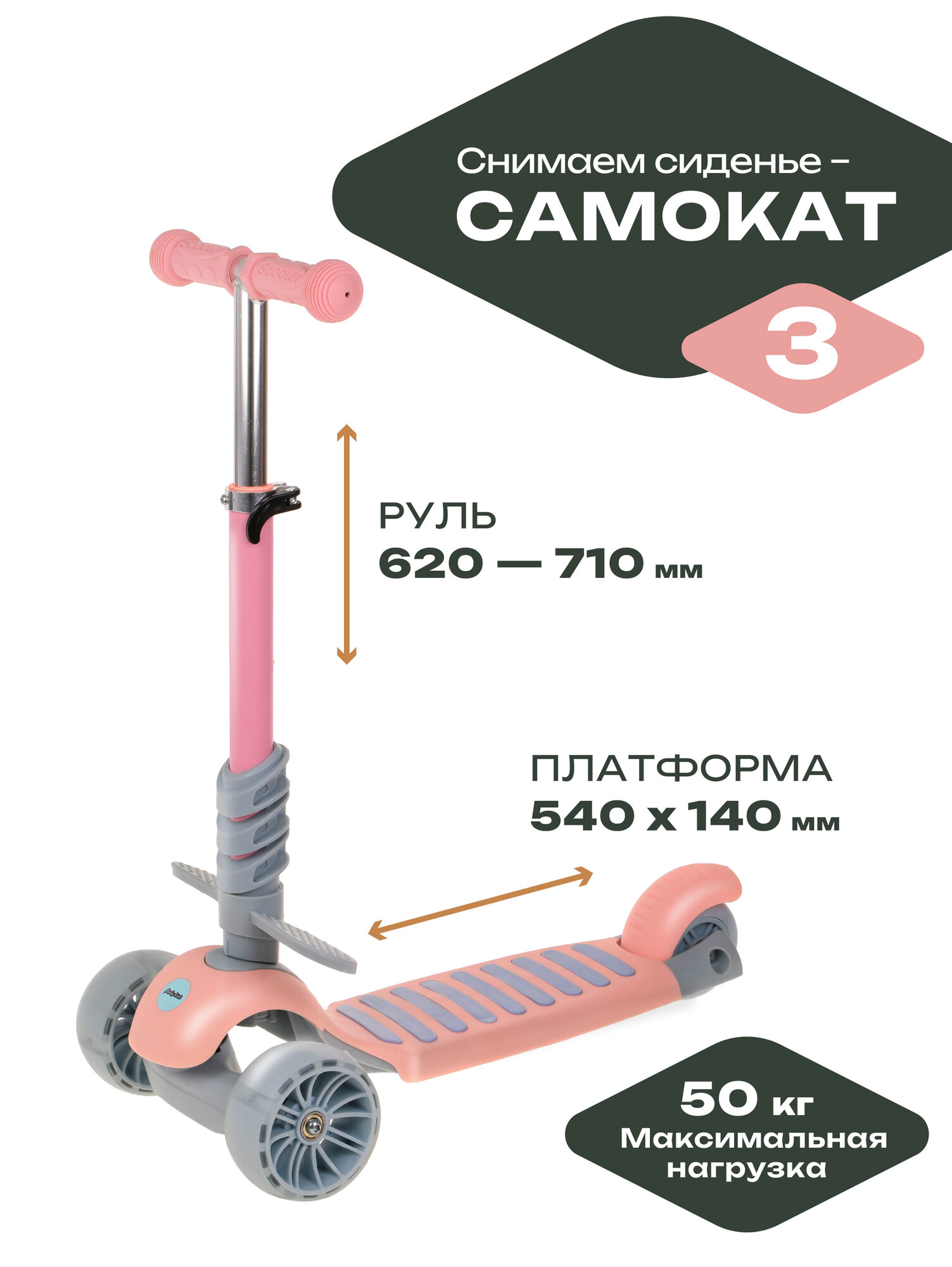 Самокат Moby Kids Pony 3 в 1, со светом, розовый