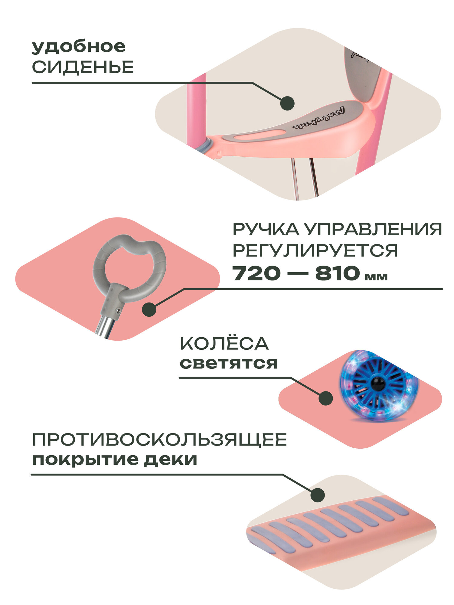 Самокат для малышей трехколесный "MobyKids" "Pony 3в1" со светом, ручкой, сиденьем (цвет розовый)