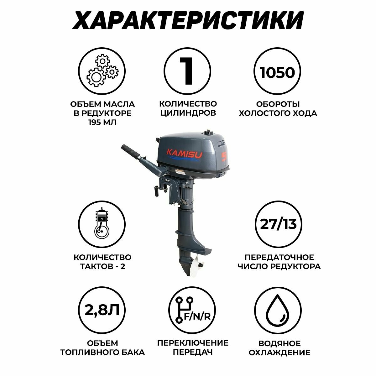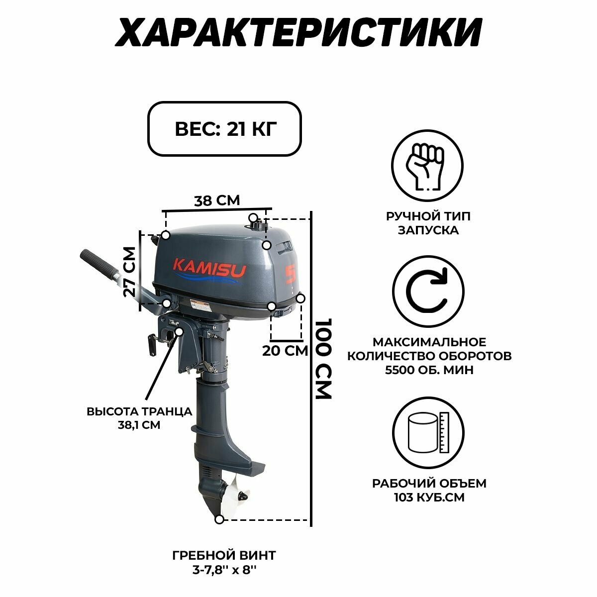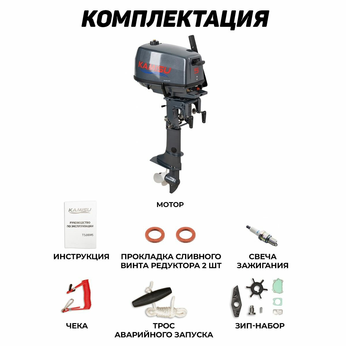 Лодочный мотор KAMISU T5BMS, бензиновый, 5 л.с., 103 куб.см, 2 тактный, 3,7 кВт