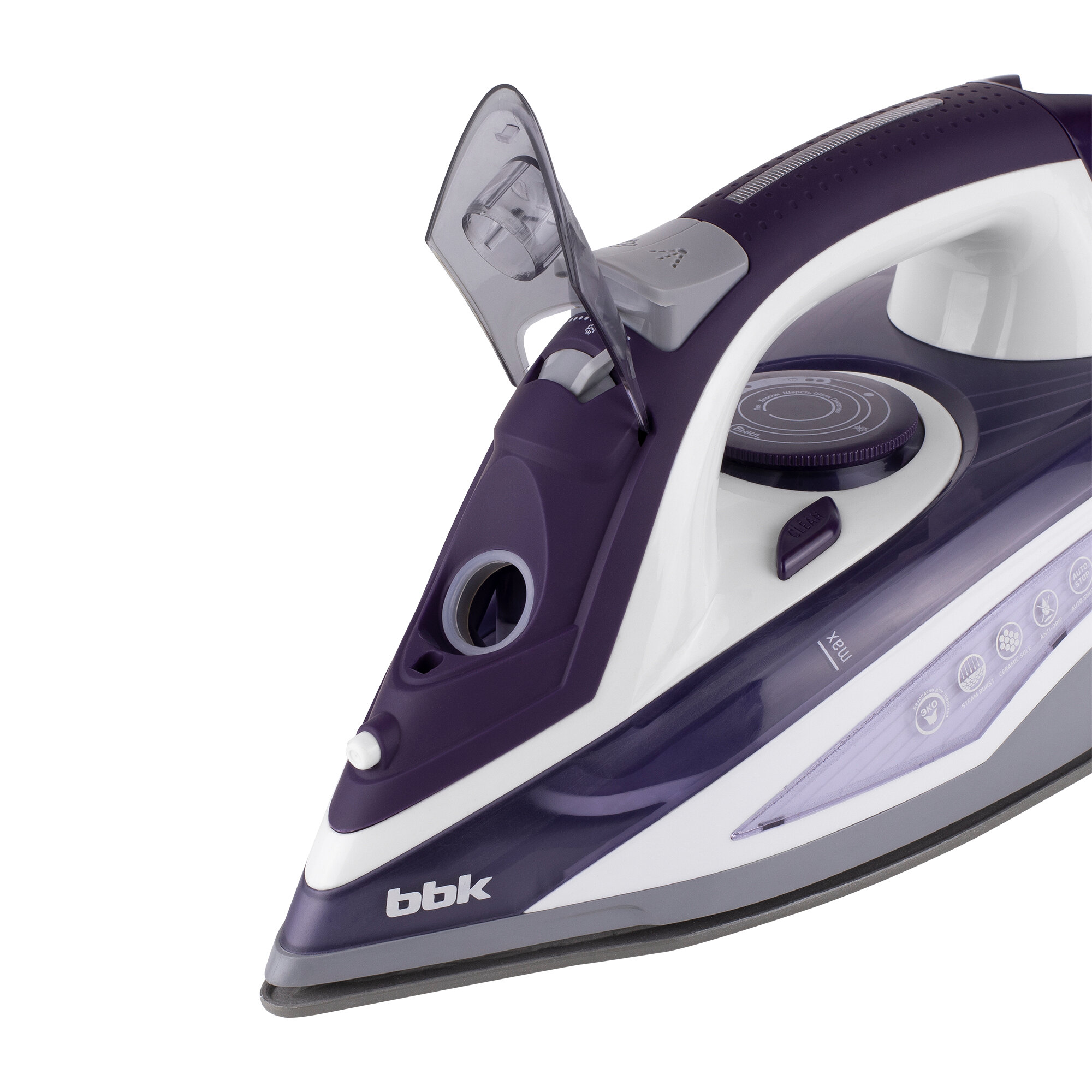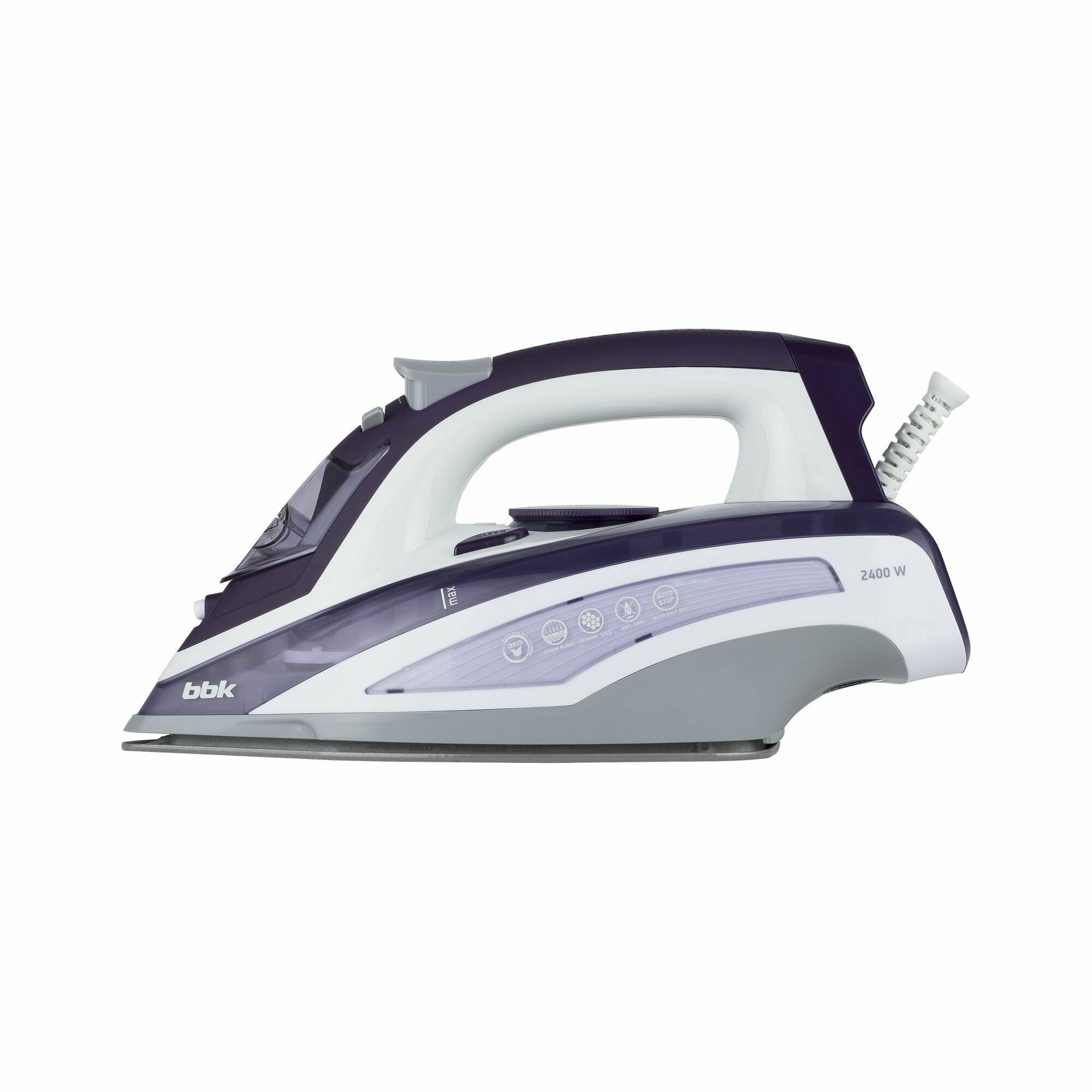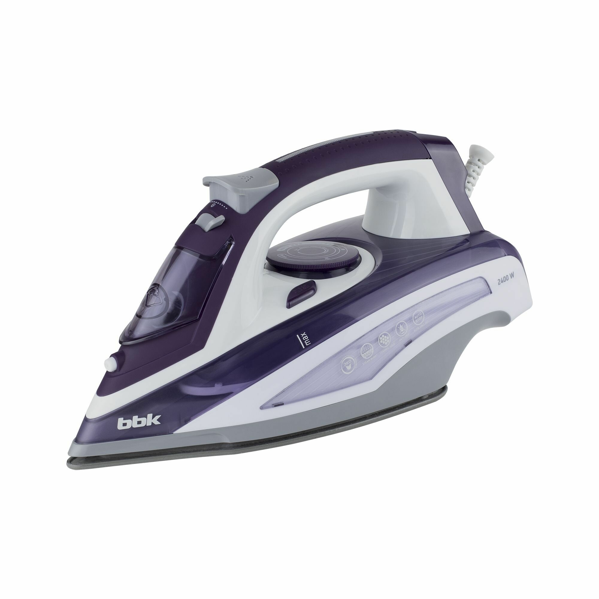 Утюг электрический BBK ISE-2404 фиолетовый, мощность 2400 Вт, вертикальное отпаривание, функция анти-капля, функция самоочистки, автоматическое отключение, объем резервуара для воды 440 мл