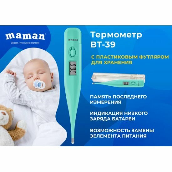 Электронный термометр для тела Maman BT-39, без ртутный, звуковой сигнал, автоотключение, цвет мятный
