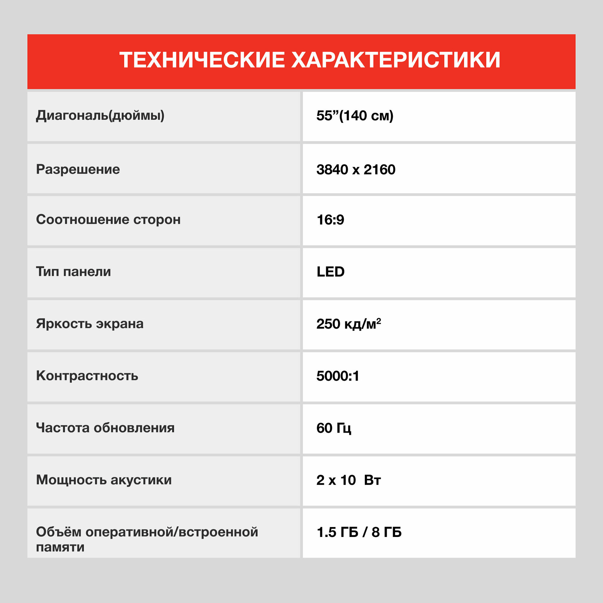 Телевизор Starwind SW-LED55UG403, 55", 3840x2160, DVB-T/T2/C/S2, HDMI 3, USB 2, Smart TV 9767553