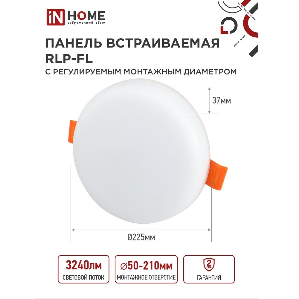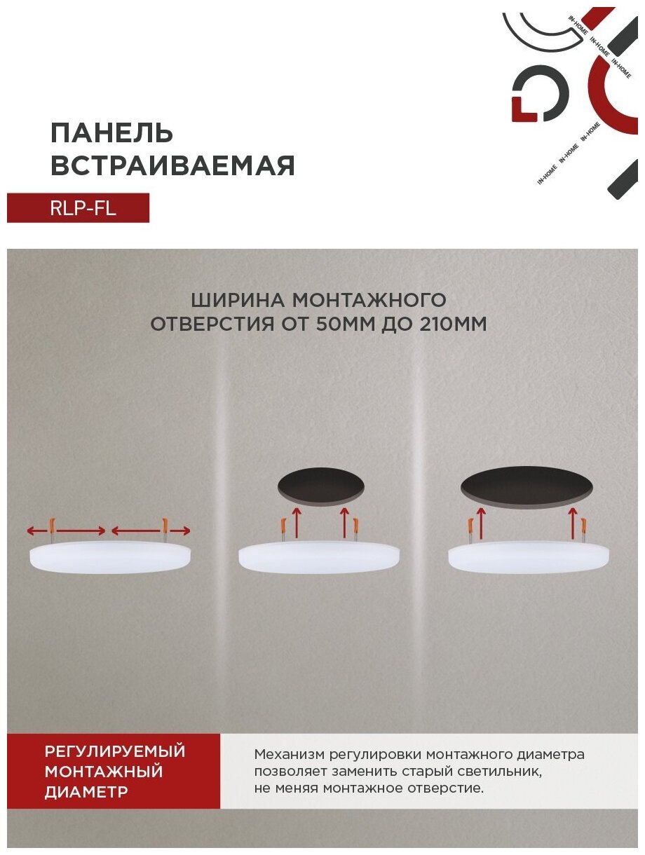 IN HOME Панель сд встр безрам RLP-FL 10Вт 230В 6500К 900Лм 100мм с рег. монтаж. 45-80мм белая IP20 (арт. 4690612036724)