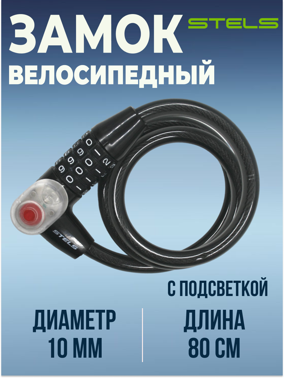 Купить Трос-замок STELS 10х800мм 84608 с кодовым замком с подсветкой со стальным тросом, чёрный NEW