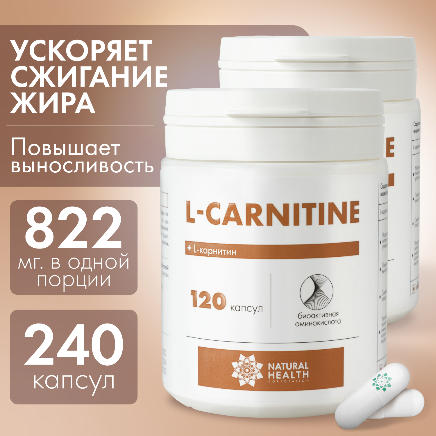 L Карнитин 822 мг, жиросжигатель для похудения, 120 капсул, Natural Health, Натуральное Здоровье