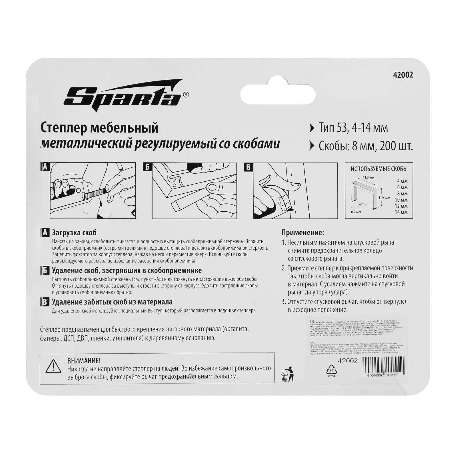 Степлер мебельный SPARTA, стальной, регулируемый, тип скобы: 53, 4-14 мм, комплект 200 скоб, 42002 (арт. 670221)