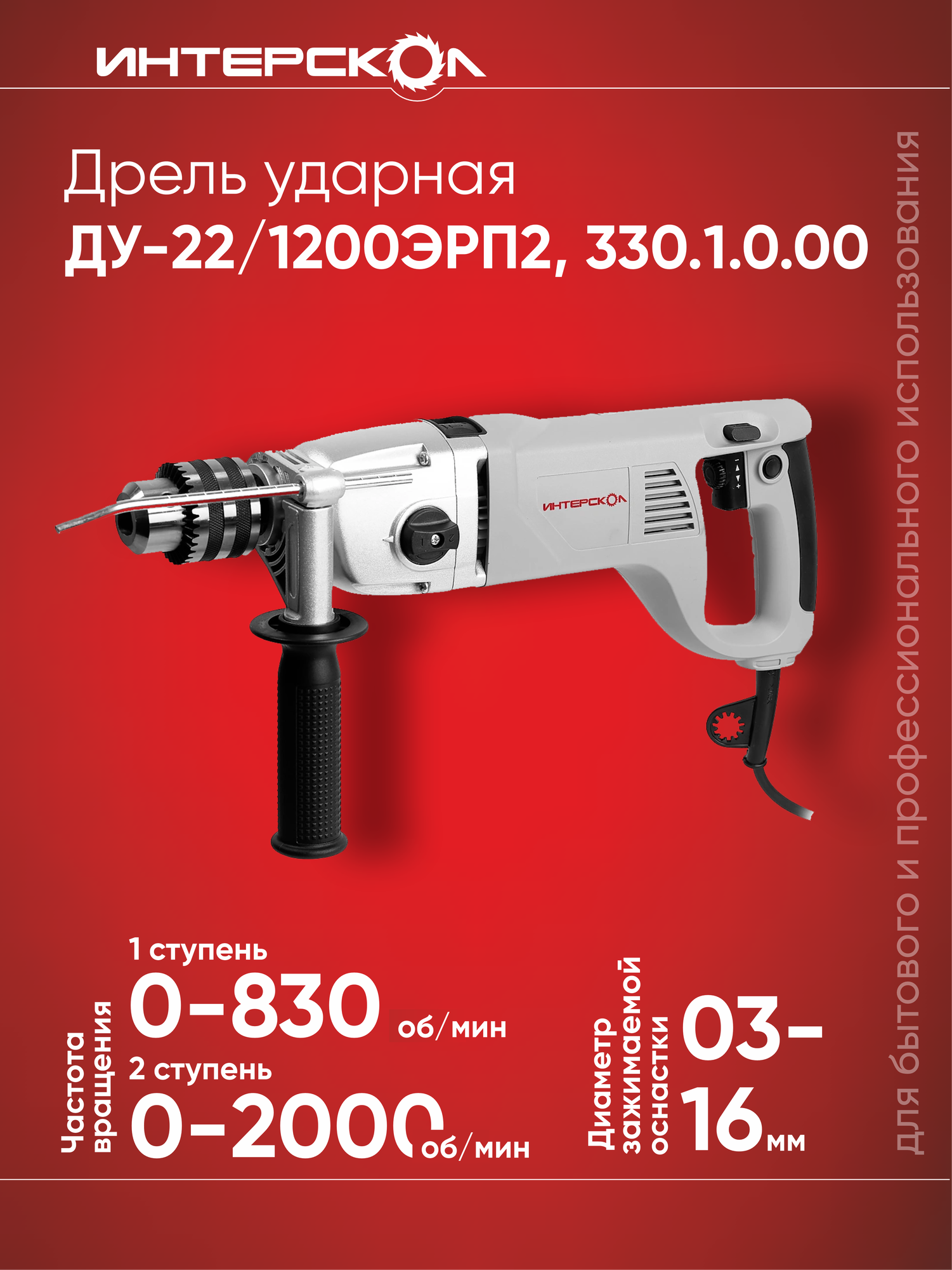 Дрель ИНТЕРСКОЛ ДУ-22/1200ЭРП2, без кейса, арт. 330.1.0.00