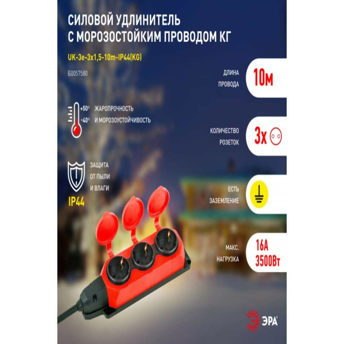 Купить ЭРА Удлинитель силовой UK3e3x1,510mIP44(KG) с заземлением 3 розетки каучук 10м КГ 3x1,5мм2 IP44 Б005 .