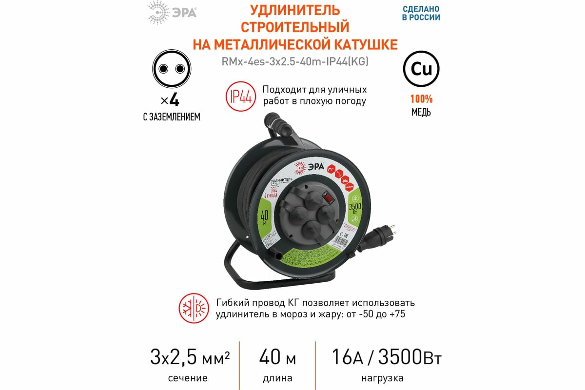 ЭРА RMx-4es-3x2.5-40m-IP44(KG) Удлинитель силовой на металлической катушке c/з 4 гн 40м КГ 3х2.5