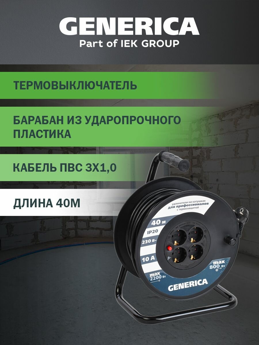 Удлинитель на катушке GENERICA УК40 с термозащитой 4 места 2P+PE/40м 3х1,0мм2