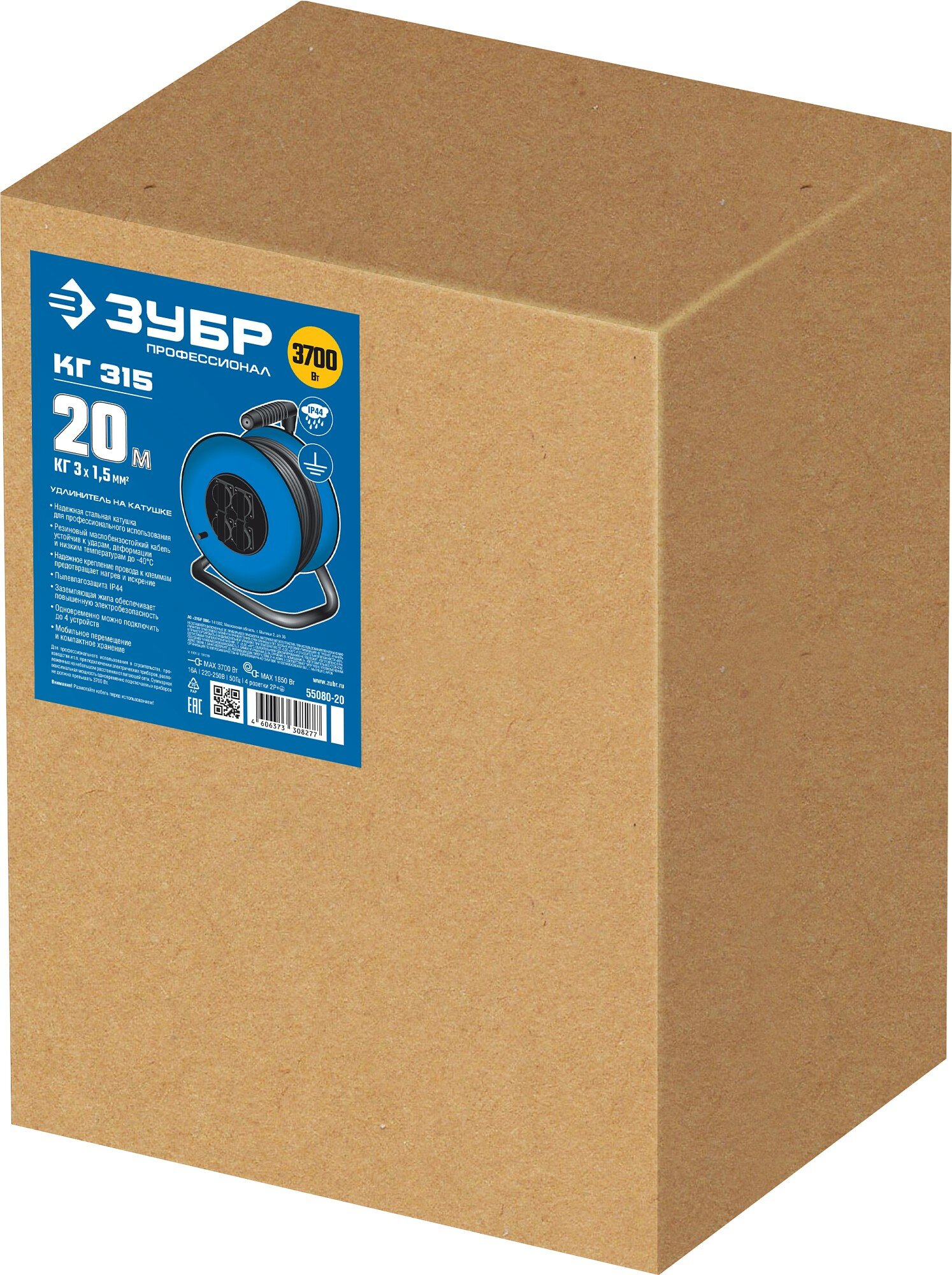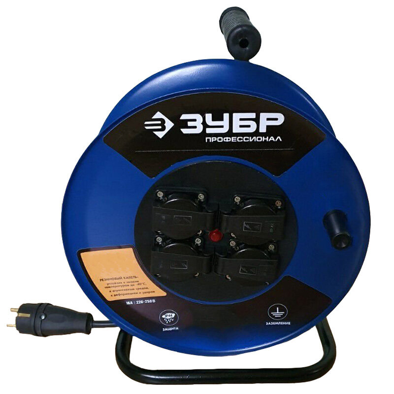 Удлинитель Зубр 55080-20 на катушке "КГ 315", 20 м, 3700 Вт, 4 гнезда, Ip44, КГ 3х1,5 кв мм .