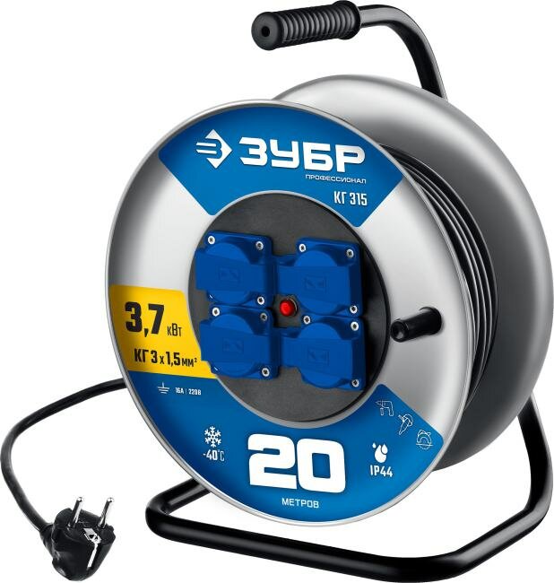 ЗУБР КГ-315 КГ 3х1.5 20м 3700Вт IP44, Силовой удлинитель на стальной катушке (55080-20)