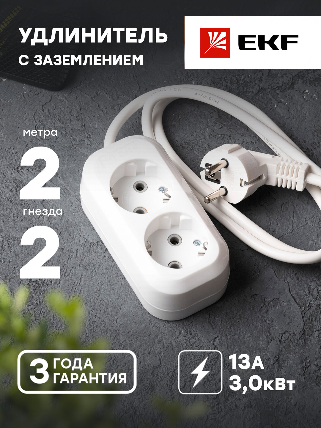 Удлинитель Эксперт 2 гнезда 2 метра 13А-3,0кВт с заземлением ПВС 3х1 EKF PROxima