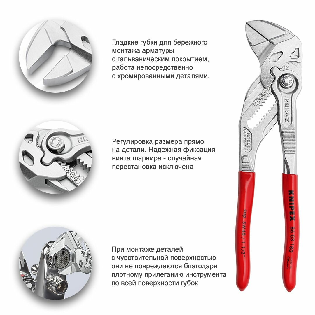 Клещи переставные-гаечный ключ KNIPEX зев 40 мм, длина 180 мм./ Разводной ключ / KN-8603180 интересное: