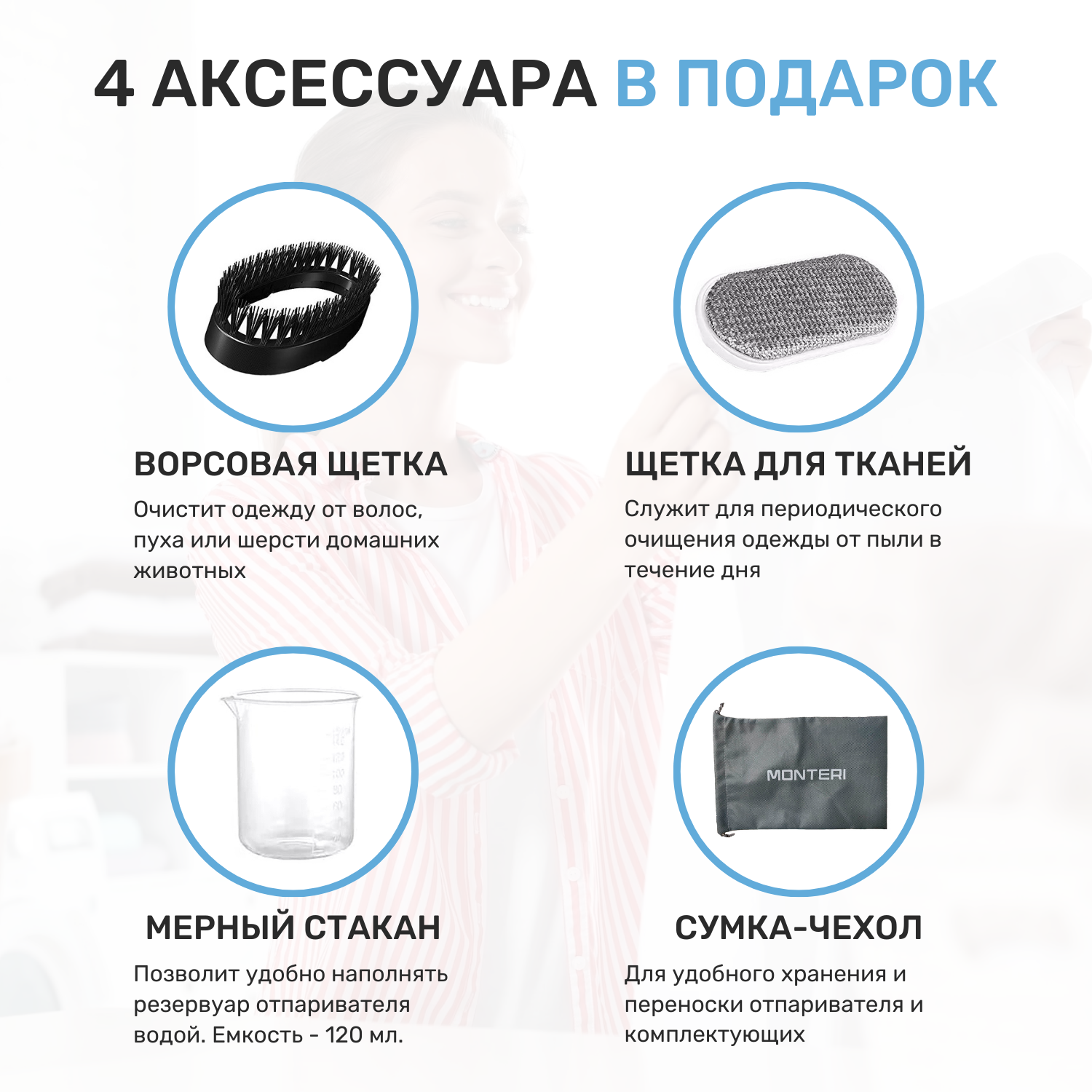 Отпариватель для одежды ручной MONTERI Dampfer T10, вертикальное и горизонтальное отпаривание, парогенератор для дома, мощный вертикальный паровой утюг интересное: