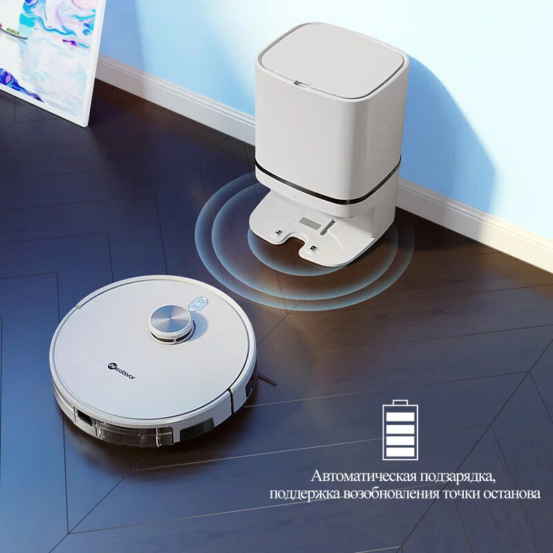 | Плюсы: | Красивый дизайн в чисто белом цвете ,внешне выглядит достойно, богато, в любой интерьер впишется. Расположение станции требует наличие розетки, для её постоянного подключения. Украшает переливающееся стекло на корпусе пылесоса, лидар интересно играет на свету, и сама кнопка. Наличие мягкого бампера, удобно: не бьётся о мебель. Несколько режимом работы, а т.же регулировка самой мощности, это отражается на громкости работы пылесоса. Уборку ( сухую ) моего загородного дома ( 1-й этаж ) совершает за 40 мин., полностью пролез везде где смог поместиться своим размером. Все ножки стола, диванов, кресел видит, объезжает вокруг каждой.