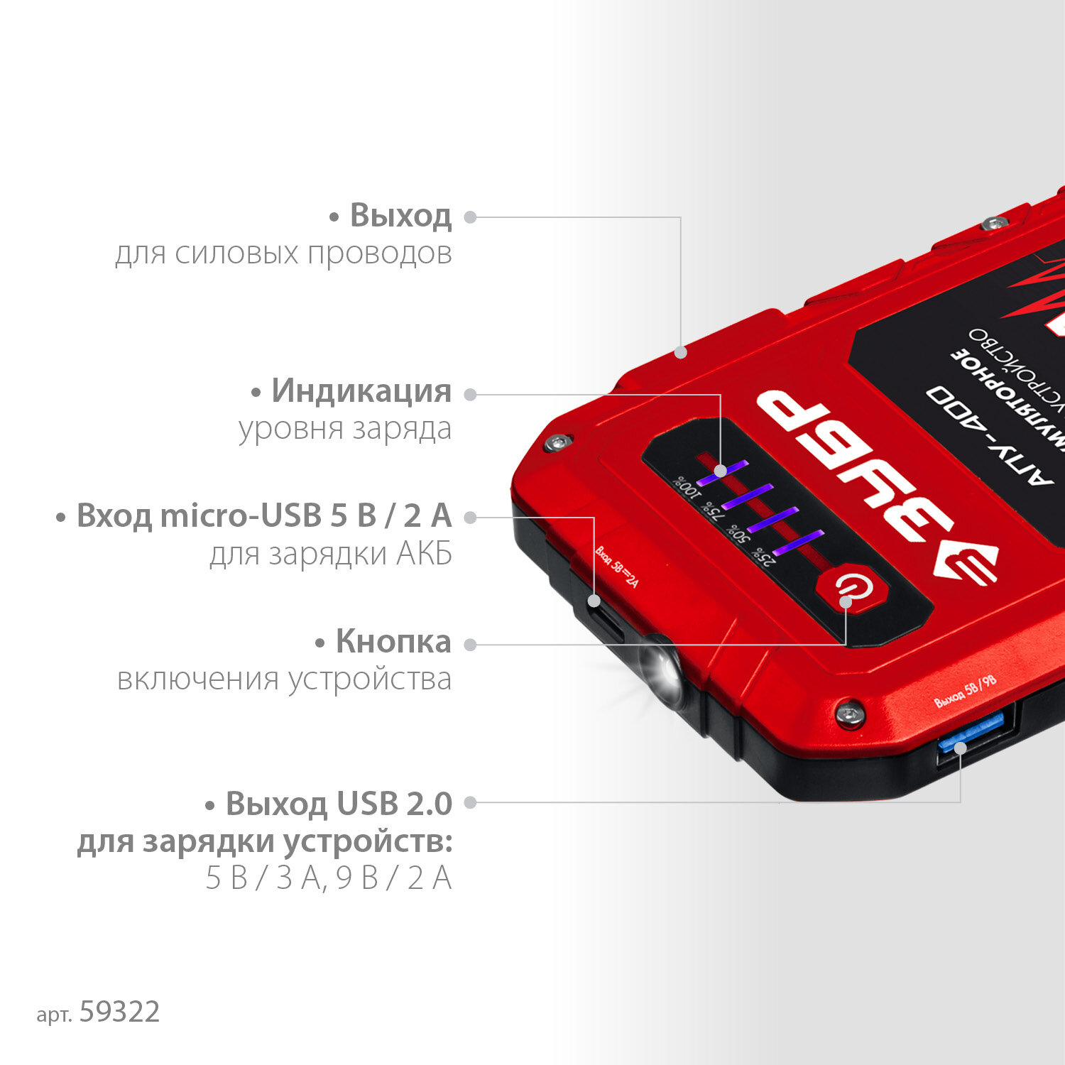 ЗУБР АПУ-400 12В, макс. 400А аккумуляторное пусковое устройство (59322)