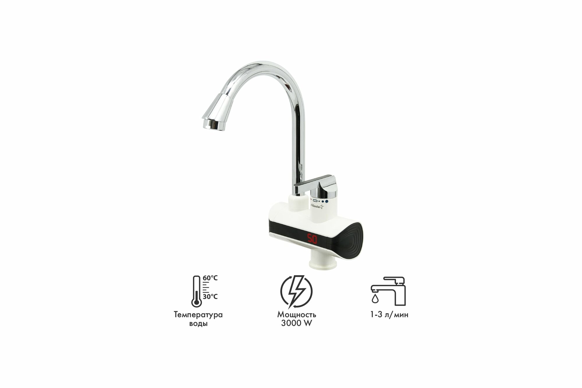 Водонагреватель проточный электрический ATLANTA ATH-7432, 3000 Вт, LED дисплей, нагрев потока 30-65 C