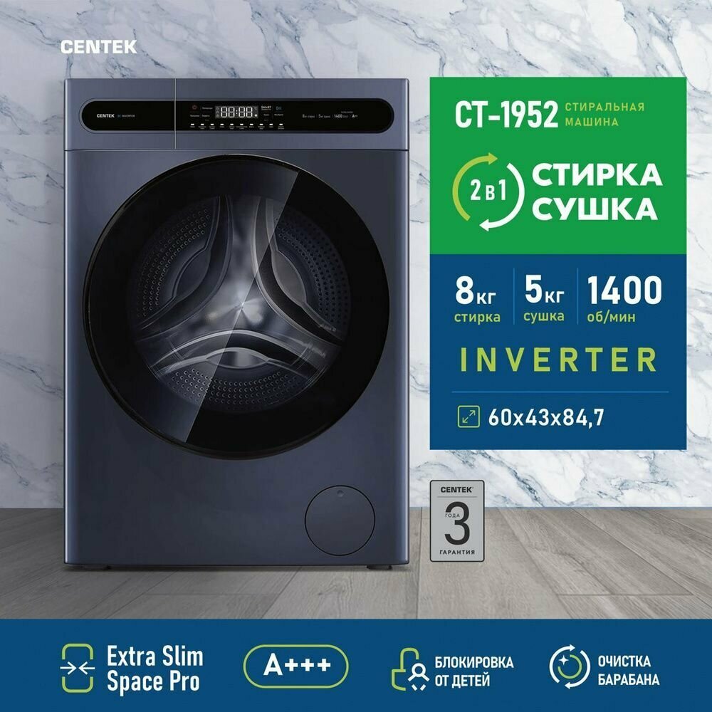 Стиральная машина Centek Ct-1951, класс A+++, 1400 об/мин, 8 кг, сушка 5 кг, Inverter, белая Centek .