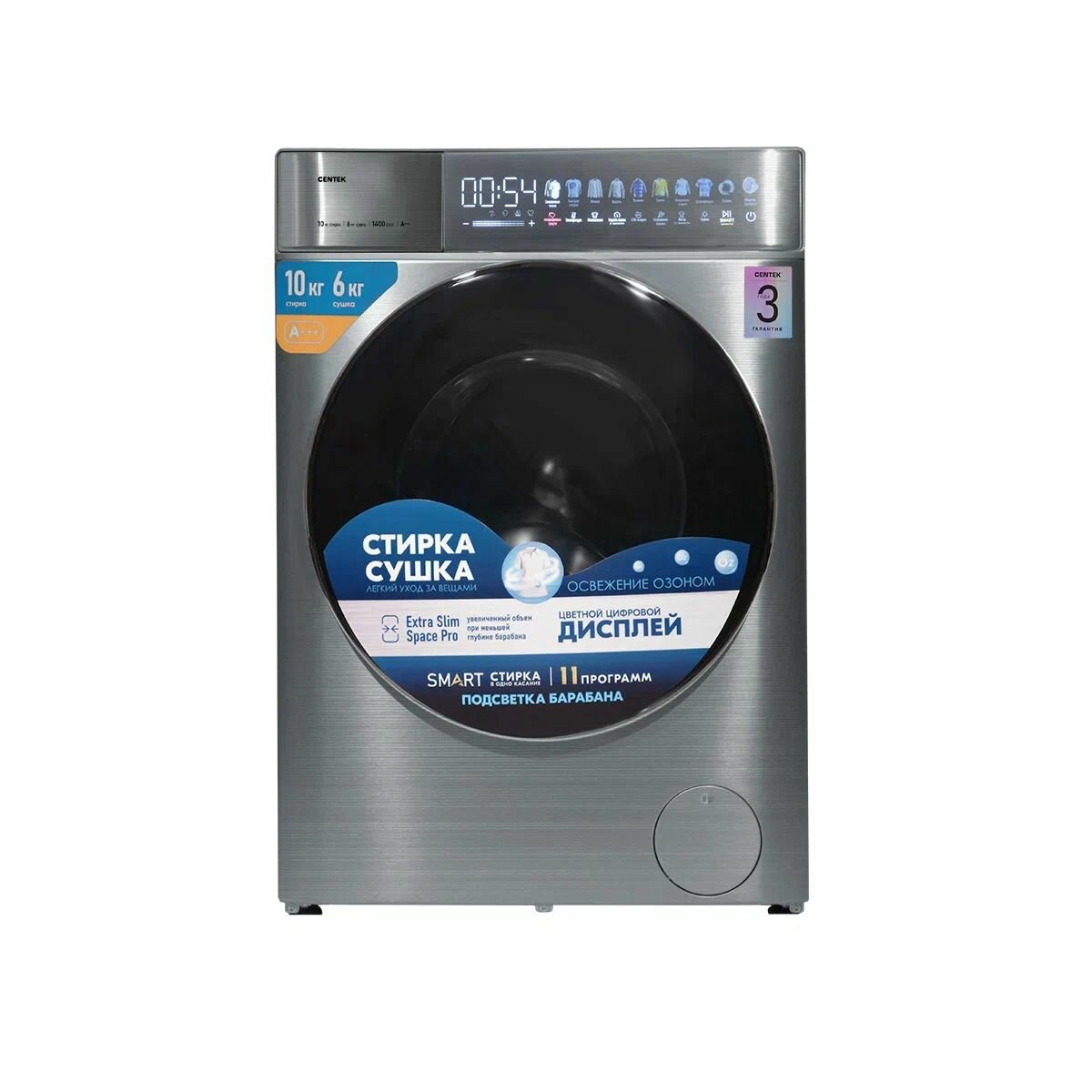 Стиральная машина с сушкой, инвертором и паром Centek CT-1976 /автомат//Серый графит/10кг/6кг/11пр/Прямой привод/Узкая/Озонирование/Цветной сенсор/A+++/3 года гарантии