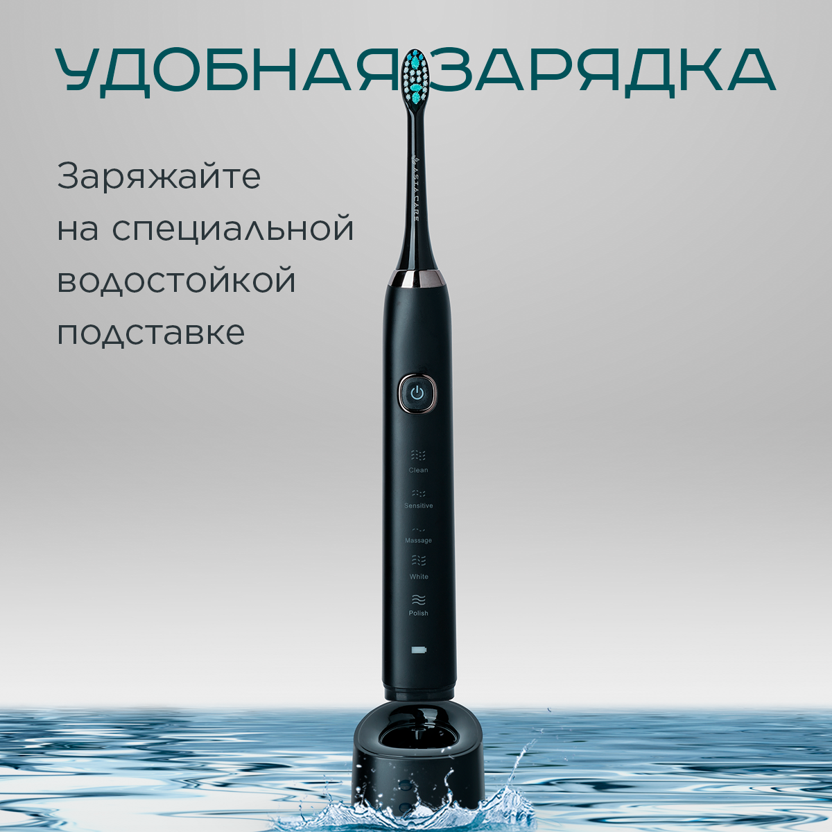 Электрическая зубная щетка AsiaCare S100, 5 режимов работы, 2 насадки, с таймером 4*30 сек, влагозащита IPX7, 30 дней на 1й зарядке. Чёрная
