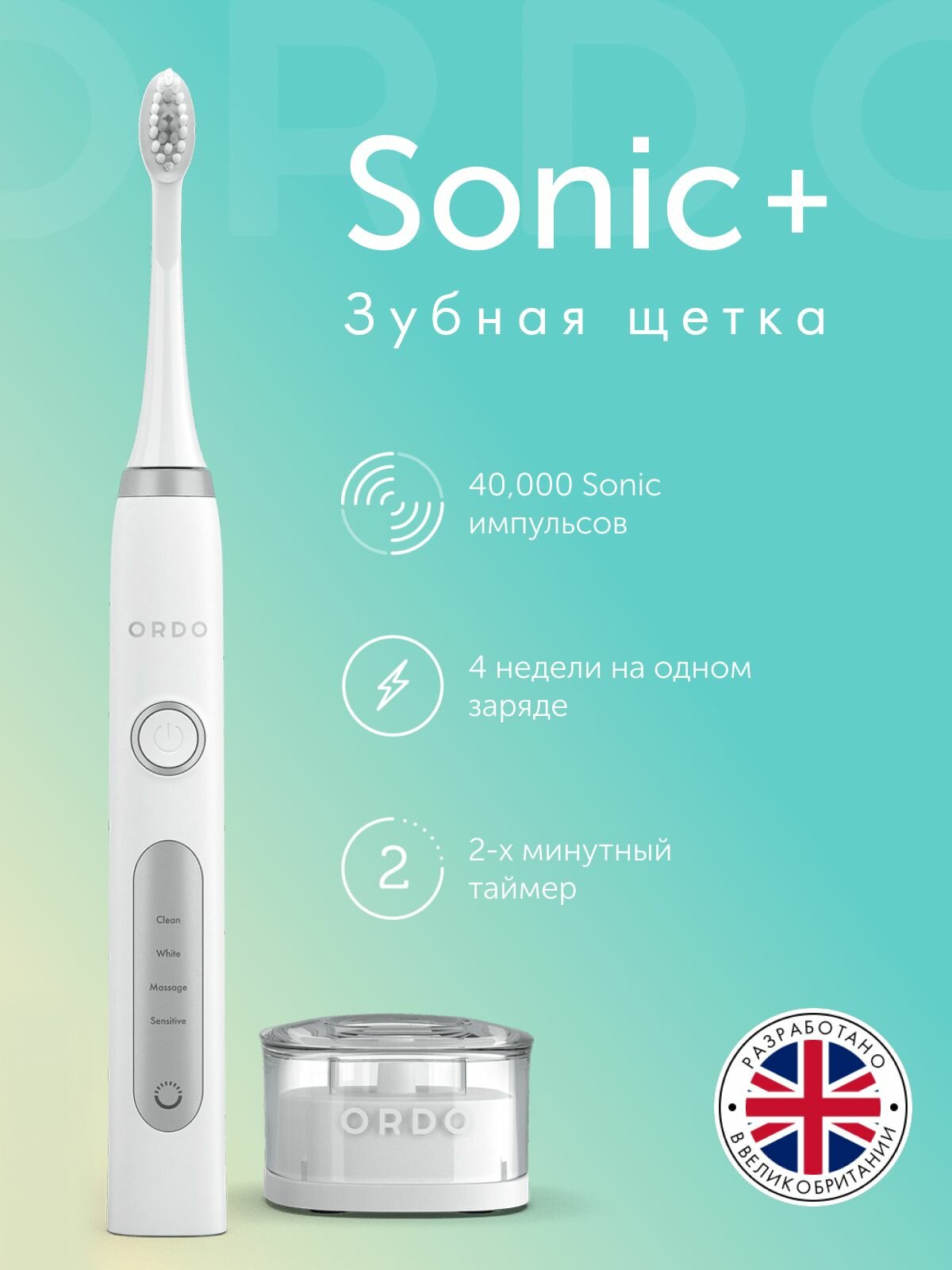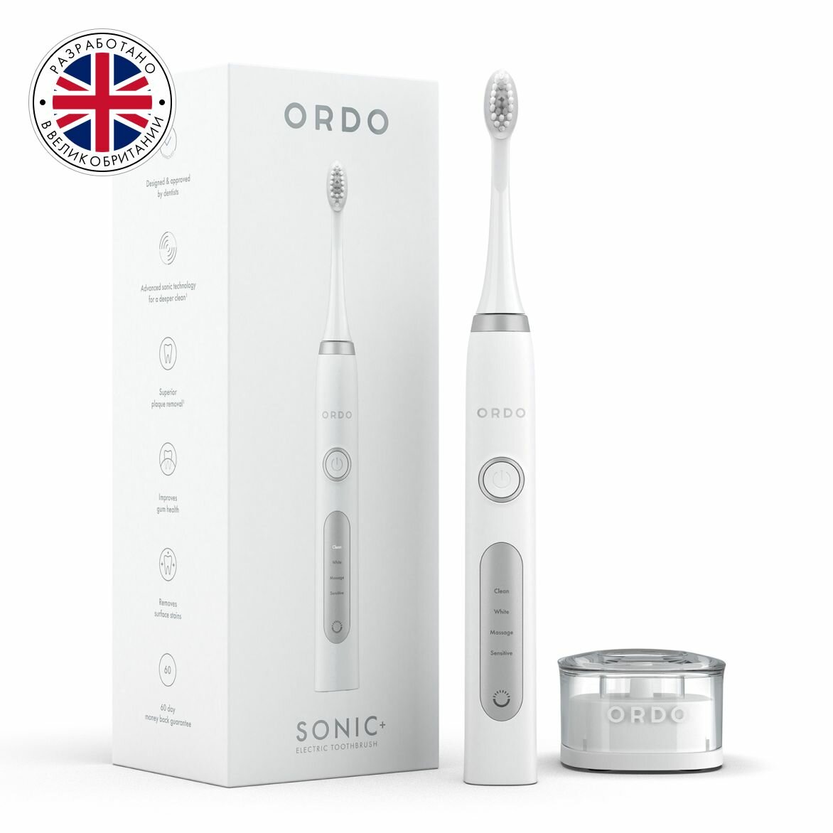 Купить Электрическая зубная щетка ORDO Sonic+ с 4 режимами, таймером, защитным колпачком и зарядным устройством, белая