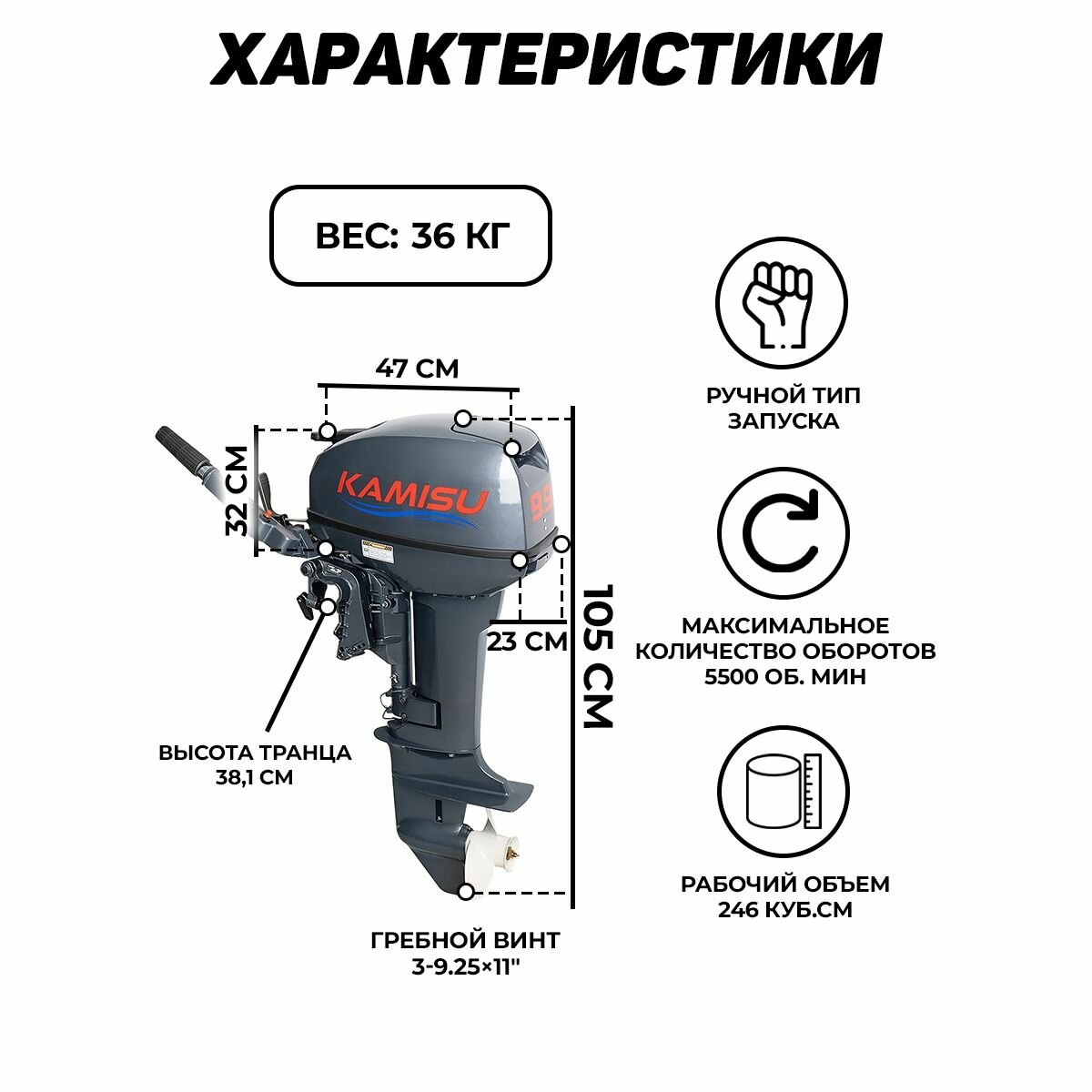 Лодочный мотор KAMISU T9.9BMS, бензиновый, 15 л.с., 246 куб.см, 2 тактный, 7,3 кВт