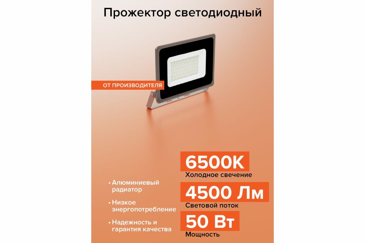 Светодиодный прожектор Wolta 50Вт 6500К Холодный белый свет, IP65, 4500Лм, серый WFL-50W/07