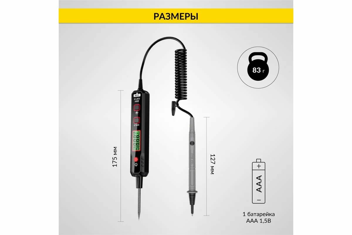 | Плюсы: | Работает с напряжением постоянного и переменного тока 12-220 v, возможность проверки цепи на обрыв, подсветка дисплея и щупа. |