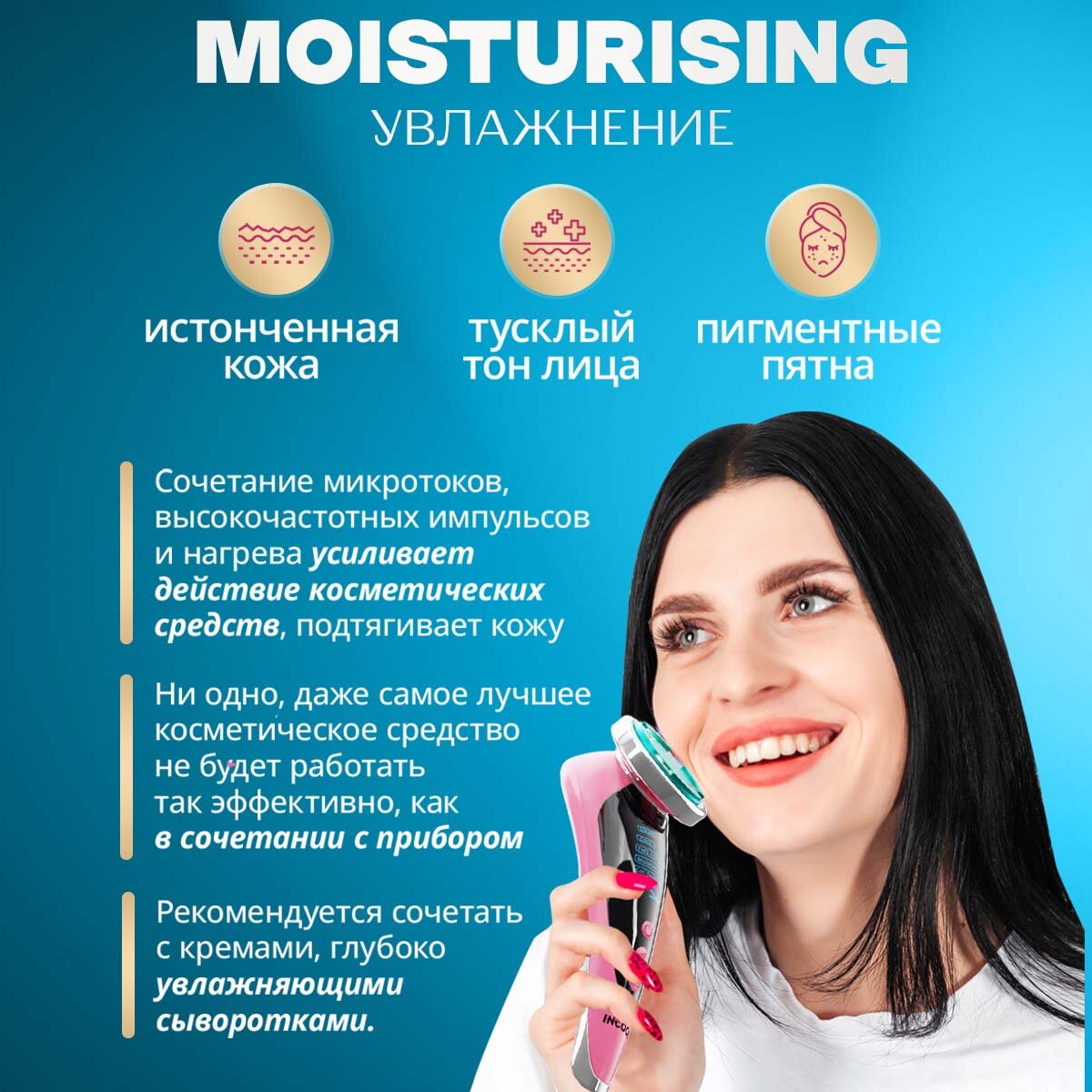 | Назначение | антивозрастной уход / лечение акне / массаж / нанесение средств по уходу / очищение / увлажнение / усиление действия косметических средств |